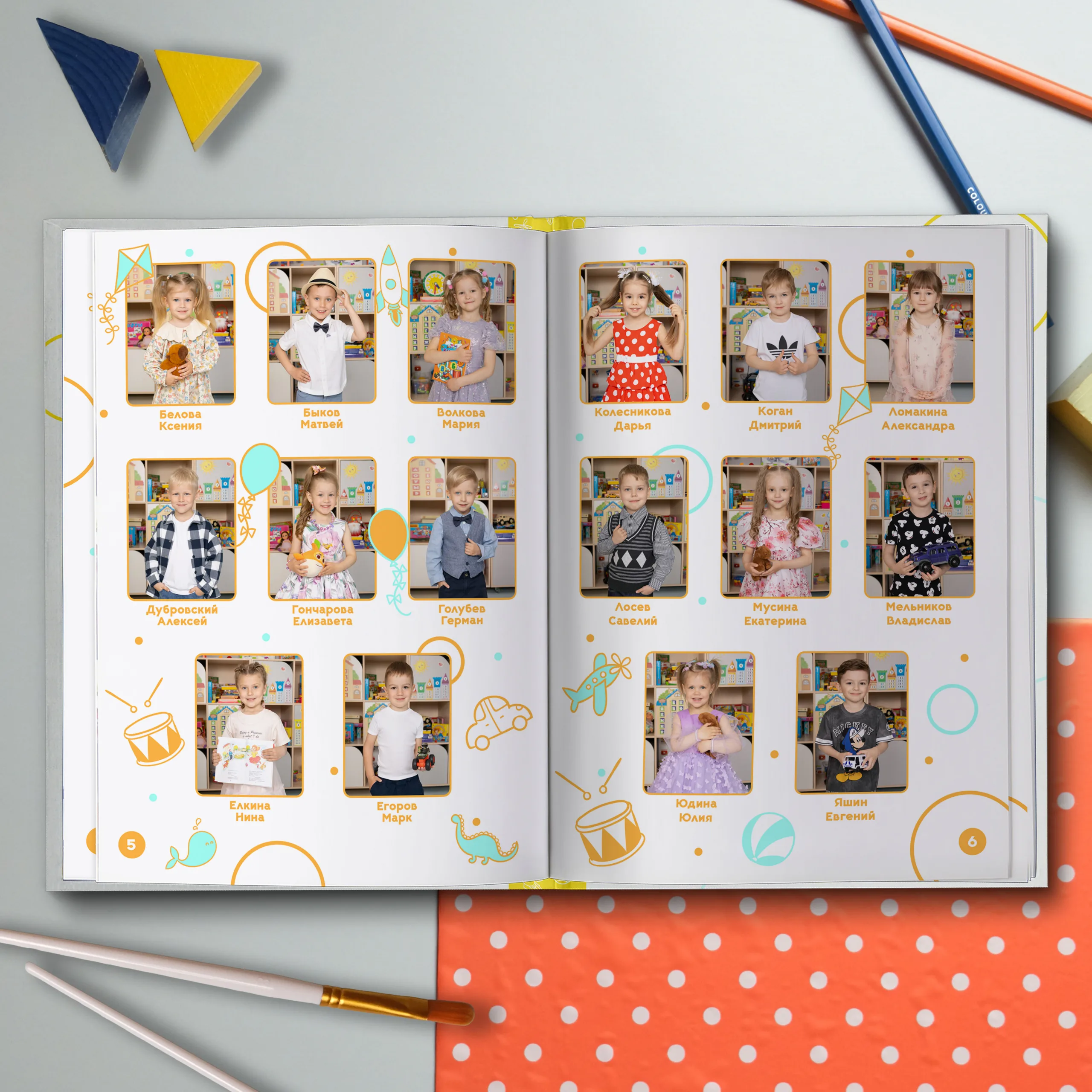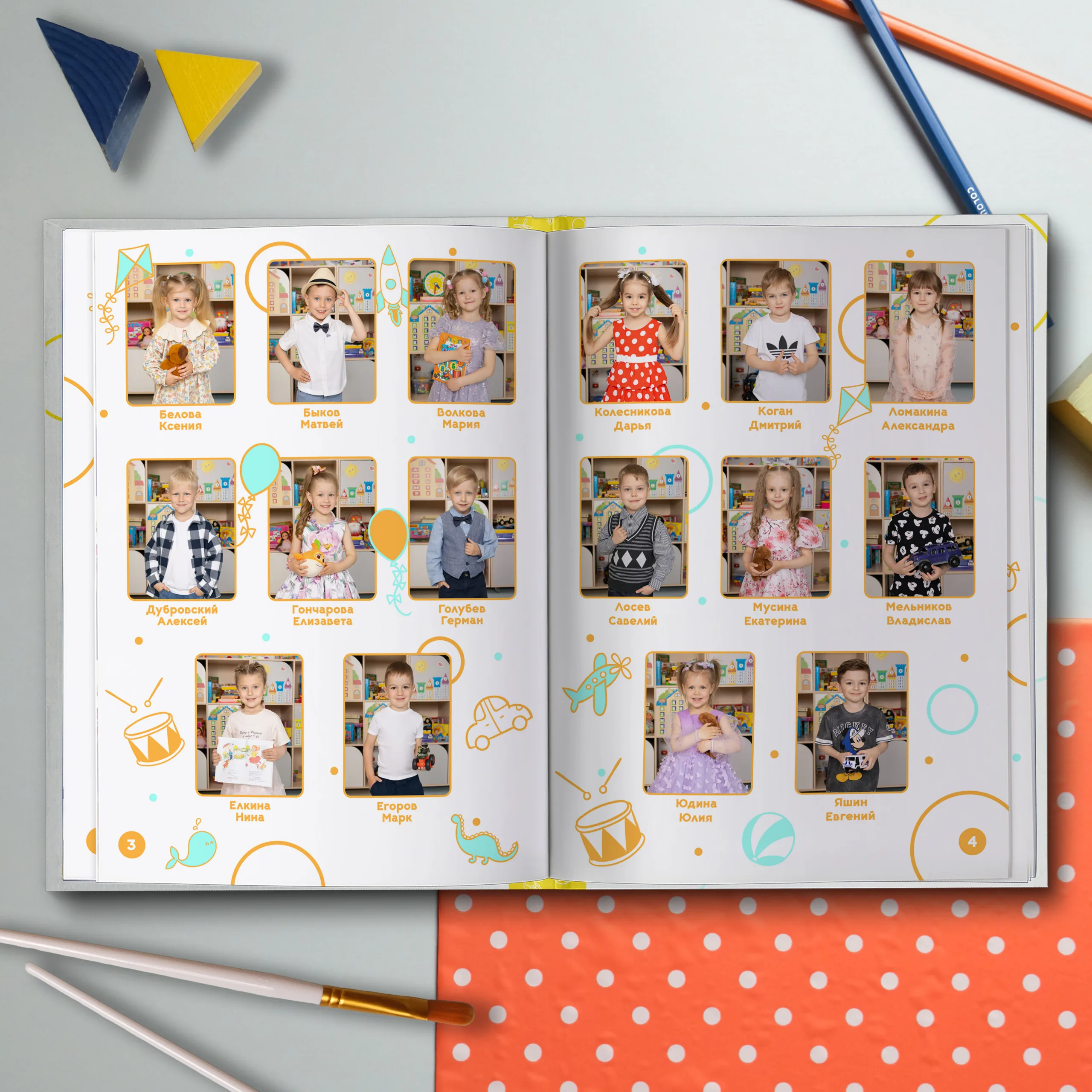 3ий разворот и далее — личные страницы выпускников (портретная фотография и 2 фотографии личного репортажа)