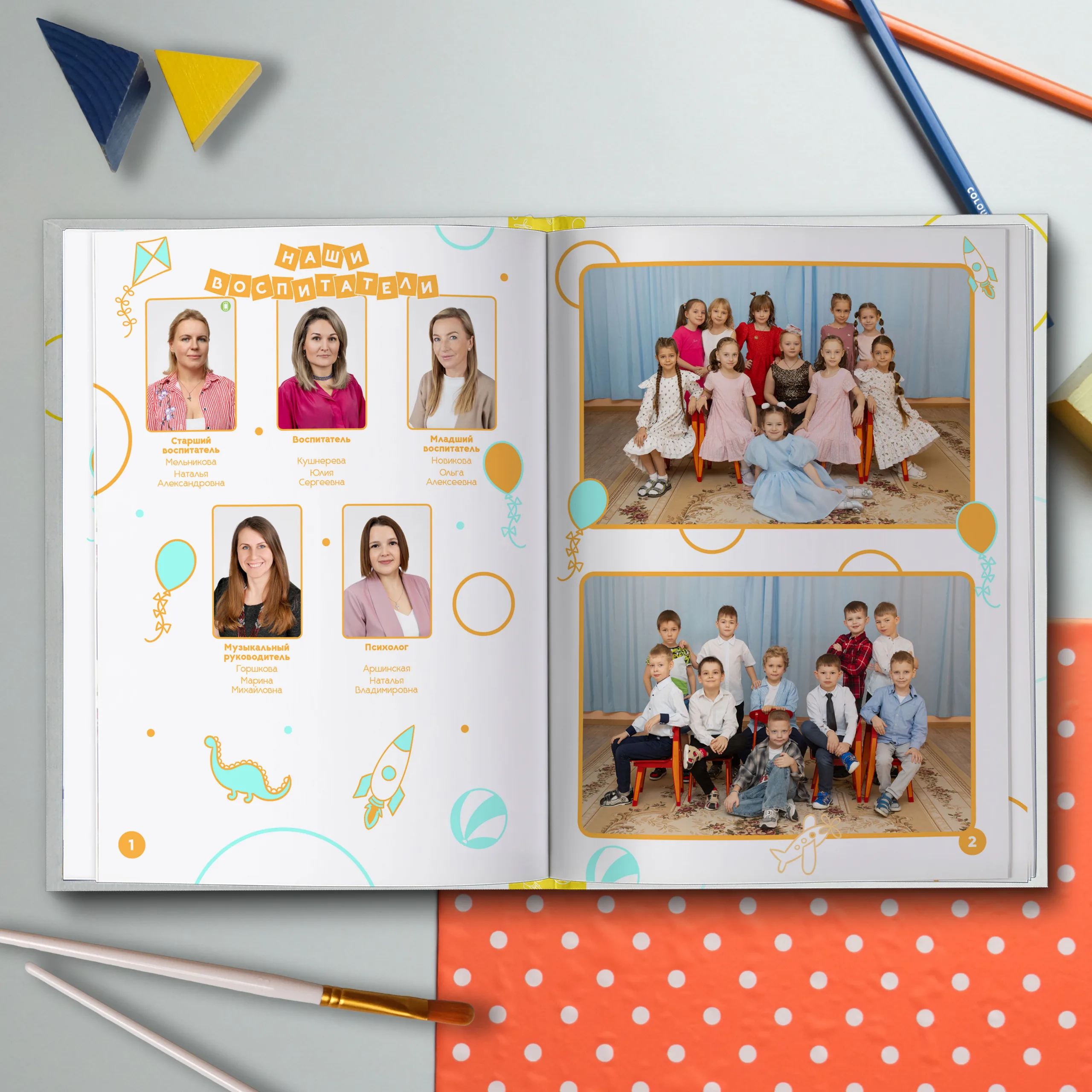 1ый разворот — виньетки педагогов и две общие фотографии